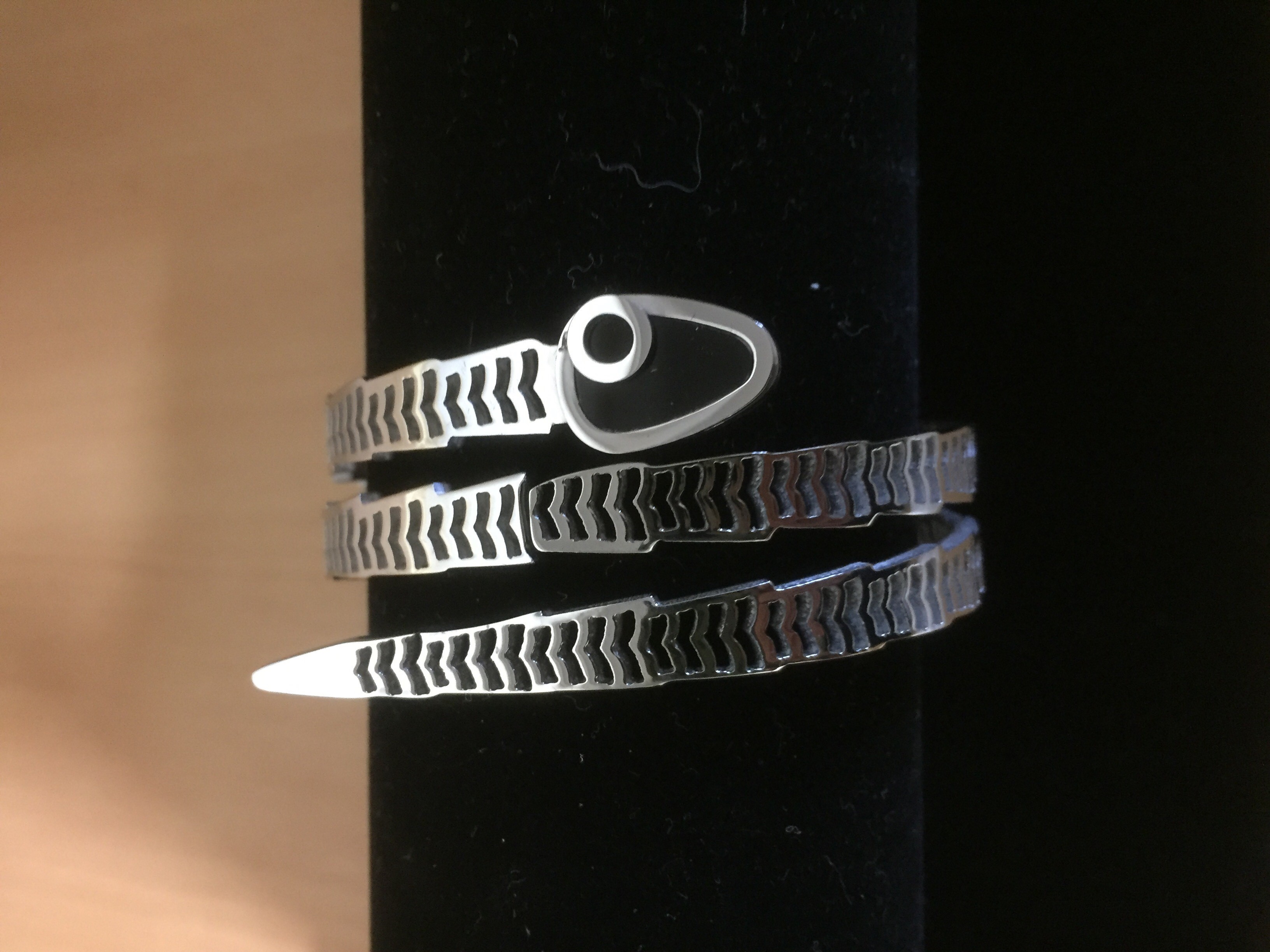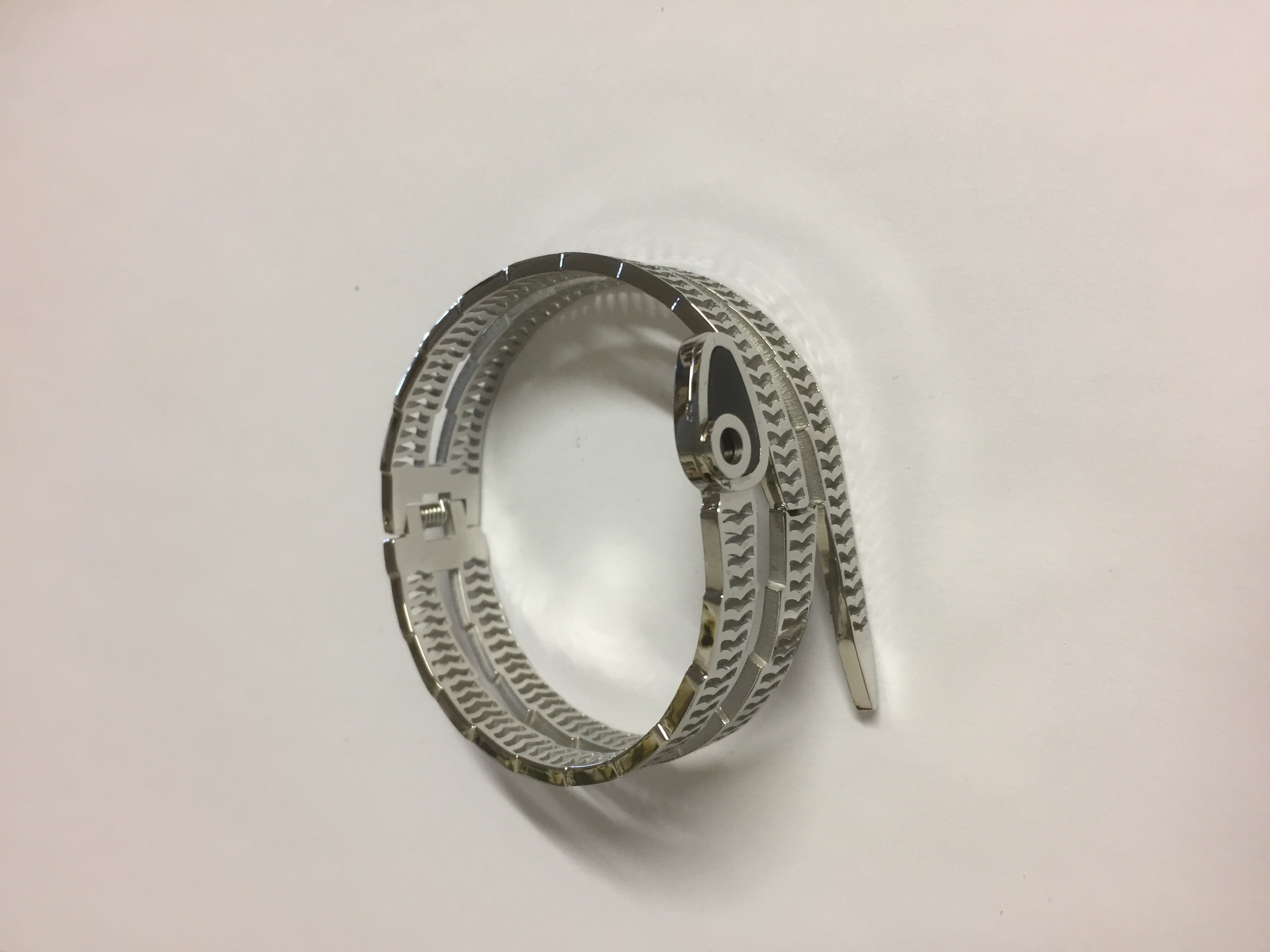 Stainless steel (RVS) armband in de vorm van een slang. Apart maar heel trendy. Deze armband is verkrijgbaar in de kleuren goud, zilver en roze. Door de handige scharniersluiting is het gemakkelijk deze armband om te doen.